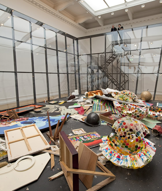 "My work is, at its core, the depiction of a contemporary dialogue. The process of constructing these paintings mirrors the construction of history. Furthermore, it depicts the hectic pace in which we gather and edit information in present society. I start with architectural interiors, symbols, and marks that represent accumulated forms of information, interaction, and memories." Grant Miller.